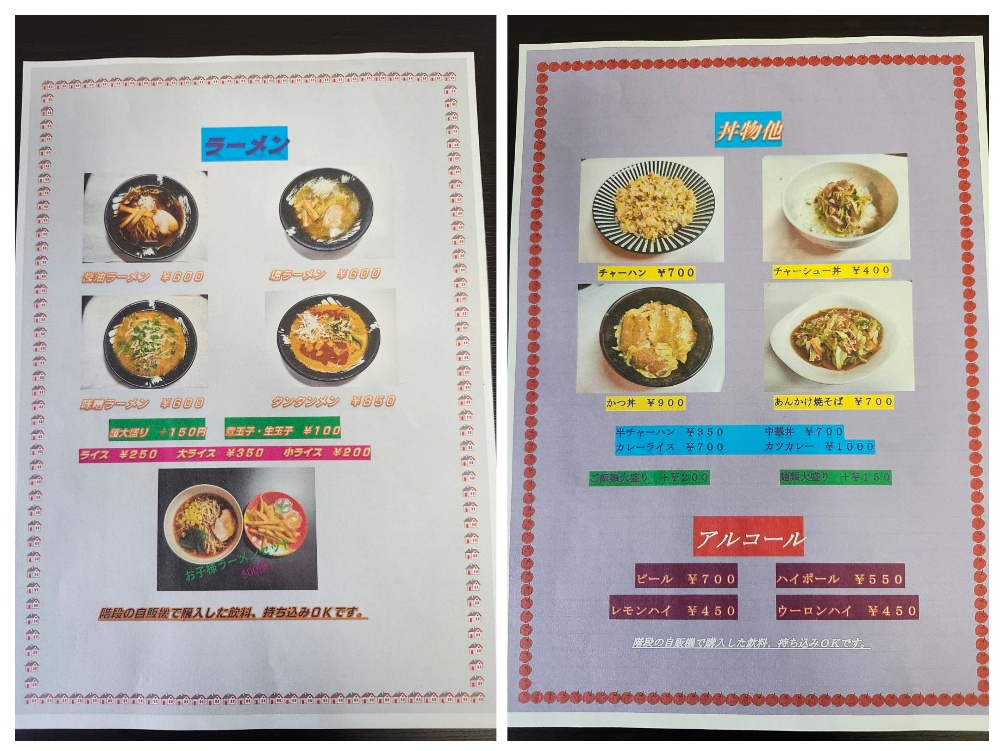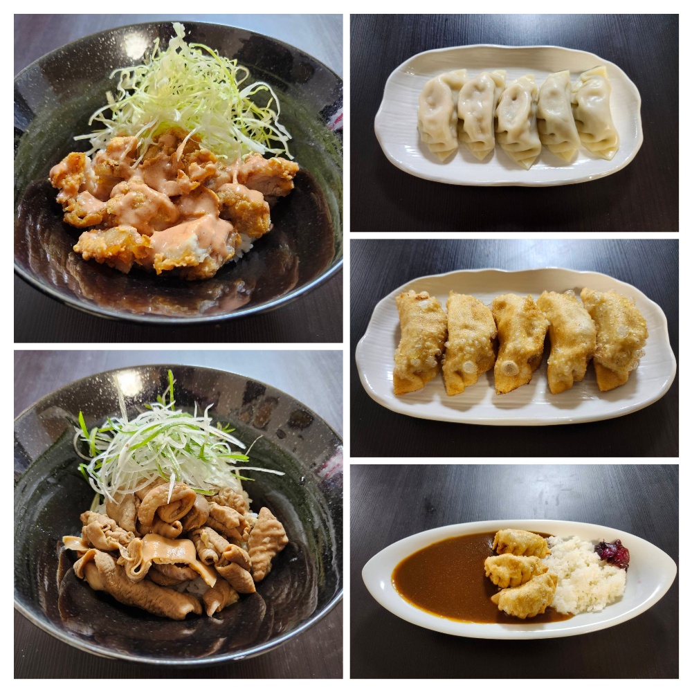 鶏唐揚げ丼 ¥500 もつ丼 ¥750 水餃子¥500(1個¥100) 揚餃子¥500(1個¥100) 餃子カレー ¥1000